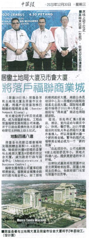 有关建设将于2年后完成建筑,成为居銮新地标,工程由居銮福联发展有限公司承建,并于日前由柔佛州务大臣拿督哈斯尼主持线上动土仪式。