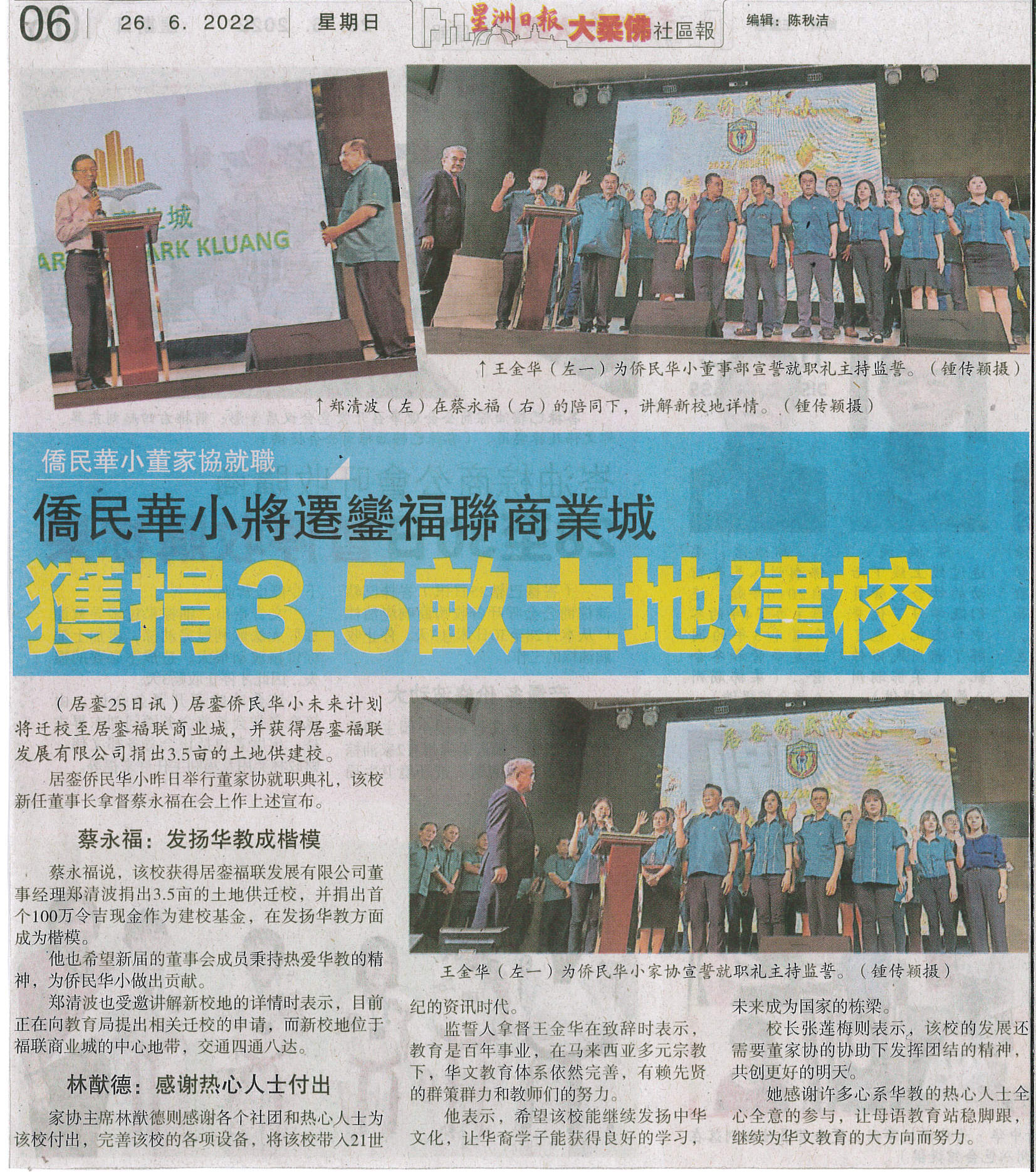 (居銮25日讯)居銮侨民华小未来计划将迁校至居銮福联商业城,并获得居銮福联发展有限公司捐出3.5亩的土地供建校。