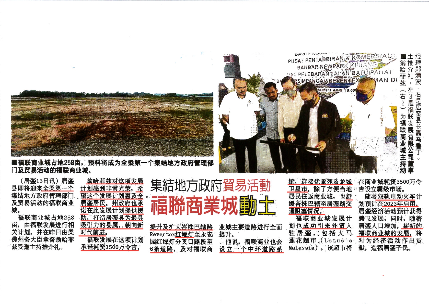 福联商业城占地258亩,由福联发展进行相关计划,并在昨日由柔佛州务大臣拿督翁哈菲兹受邀主持推介礼。