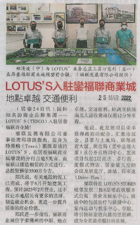 居銮福联发展有限公司董事经理郑清波指出,LOTUS’S STORES 前身为特易购(Tesco)霸级市场,将在居銮福联商业城BANDAR NEWPARK KLUANG增设分行。