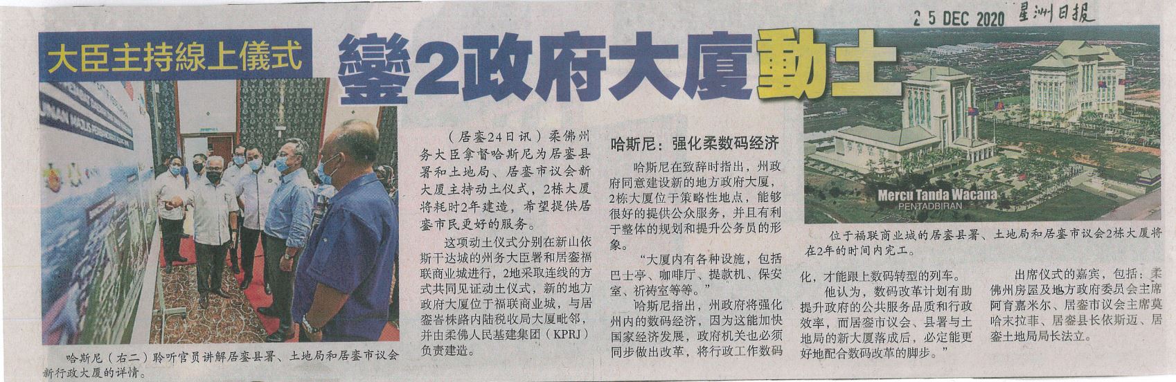 (居銮24日讯)柔佛州务大臣拿督哈斯尼为居銮县署和土地局、居銮市议会新大厦主持动土仪式,2栋大厦将耗时2年建造,希望提供居銮市民更好的服务。